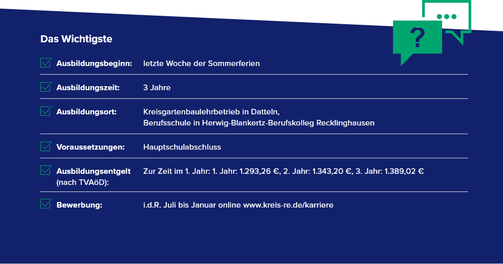 Die Ausbildung zum Gärtner bzw. zur Gärtnerin im Bereich Blumen- und Zierpflanzenbau dauert drei Jahre. Darin befasst Du Dich mit der Anzucht, Kultur und Pflege von Zimmerpflanzen, blühenden Topfpflanzen, Beet- und Balkonpflanzen sowie Schnittblumen. Der Kreis Recklinghausen unterhält in Datteln-Horneburg einen fünf Hektar großen Gartenbaulehrbetrieb. Dort kannst Du zum Beispiel im alten Obstbaumbestand, den Freilandanzuchtflächen oder im Apothekergarten jede Menge praktische Erfahrung im Gärtnerberuf sammeln. Du arbeitest dabei vor allem in den Gewächshäusern des Gartenbaulehrbetriebes. Dabei lernst Du nicht nur den Umgang mit der Pflanze, sondern auch mit Maschinen, Geräten und Produktionsstoffen. Der Besuch der Berufsschule rundet Deine Ausbildung ab.Unser Angebot - Das bieten wir dir während der Ausbildung