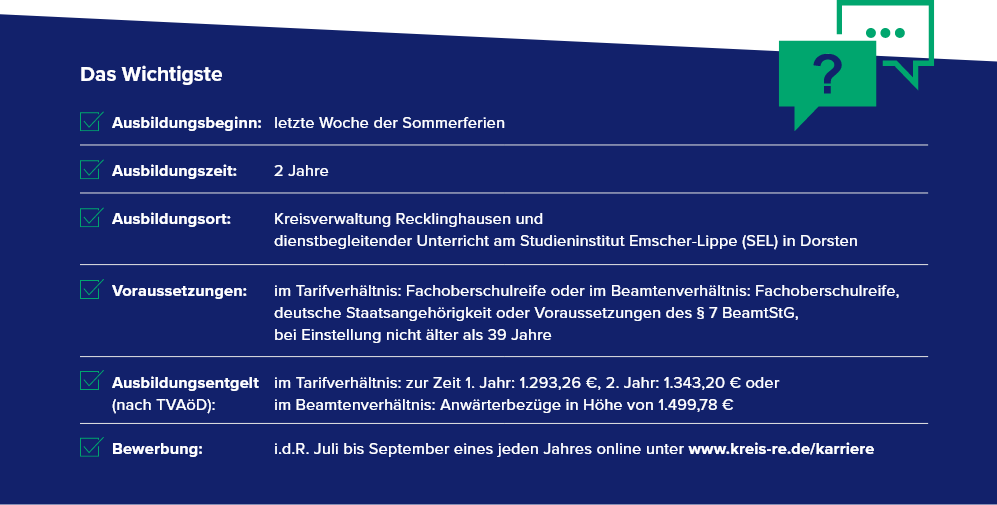 Bei allgemeinen Fragen zur Ausbildung wende dich gern per E-Mail an das Ausbildungsteam (ausbildung@kreis-re.de) oder telefonisch an Frau Kliem (Ausbildungsleitung, 02361-53 4400).