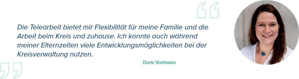 Heute ist sie im Fachbereich A – Zentrale Angelegenheiten – als Fachbereichskoordinatorin tätig. Hier kümmert sie sich als Steuerungsunterstützung vor allem um fachbereichsübergreifende Angelegenheiten und Personalcontrolling-Themen. Für ihren Job ist es nicht nur erforderlich, sich gut in verschiedene Thematiken einzuarbeiten, Informationen aufzubereiten und bereitzustellen, sondern auch, in diversen Gremien und Arbeitskreisen eingebunden zu sein. Die Vernetzung geht dabei über die Grenzen der Kreisverwaltung hinaus, etwa im Rahmen von Vergleichskreisen, in denen sich Doris mit Vertreter*innen anderer Verwaltungen über Best Practices austauscht. Die Präsenztage im Kreishaus nutzt sie vor allem für die Teilnahme an Besprechungen und den direkten Austausch mit Kolleg*innen.