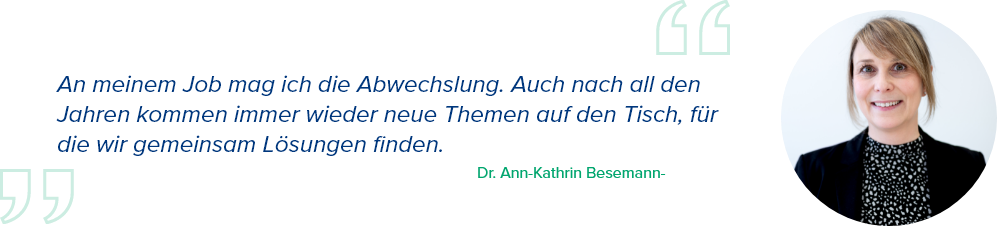 Neben vielfältigen Entwicklungsmöglichkeiten und sehr abwechslungsreichen Aufgaben ist es auch der große Zusammenhalt im Team, den Ann-Kathrin zu schätzen weiß. Darüber hinaus engagiert sie sich auch selbst für den Fachkräftenachwuchs: Als Mentorin begleitet sie zur Zeit eine junge Mentee, steht mit ihr im persönlichen Austausch und gibt dabei eigene Erfahrungen rund um Beruf und Karriereplanung weiter.