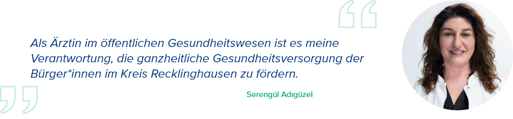 Serengül Adigüzel ist Ressortleiterin des amtsärztlichen Dienstes. Als solche kümmert sich die ehemalige Klinik-Oberärztin zusammen mit den Verwaltungen der kreisangehörigen Städte sowie den Akteuren und Einrichtungen des Gesundheitswesens im Kreisgebiet um die Gesundheit der Bürger*innen. Dazu gehören unter anderem amtsärztliche Untersuchungen und Begutachtungen oder das Abnehmen von Prüfungen in nicht-akademischen Heilberufen, zum Beispiel in der Ergo- oder Physiotherapie und im Rettungsdienst. Für zweite Leichenschauen vor Kremierungen sind Serengül Adigüzel und ihr Team ebenso geschult, wie für viele Formen subsidiärer Unterstützung – zum Beispiel feste Sprechstunden für wohnungslose Menschen.Um sich im öffentlichen Gesundheitsdienst voll einzubringen, hat sich die Fachärztin für Chirurgie während ihrer Arbeit beim Kreis zusätzlich zur Fachärztin für öffentliches Gesundheitswesen qualifiziert. Neben einer guten Atmosphäre und Zusammenarbeit im Team schätzt Serengül Adigüzel vor allem ihren abwechslungsreichen Arbeitsalltag und eine gesündere Work-Life-Balance im Gegensatz zur Klinik. So ist sie nicht nur am Schreibtisch oder im Untersuchungszimmer tätig, sondern auch in den Bezirksstellen des Gesundheitsamtes im Kreisgebiet unterwegs, um sich mit ihren Kolleg*innen über medizinische Fälle auszutauschen.