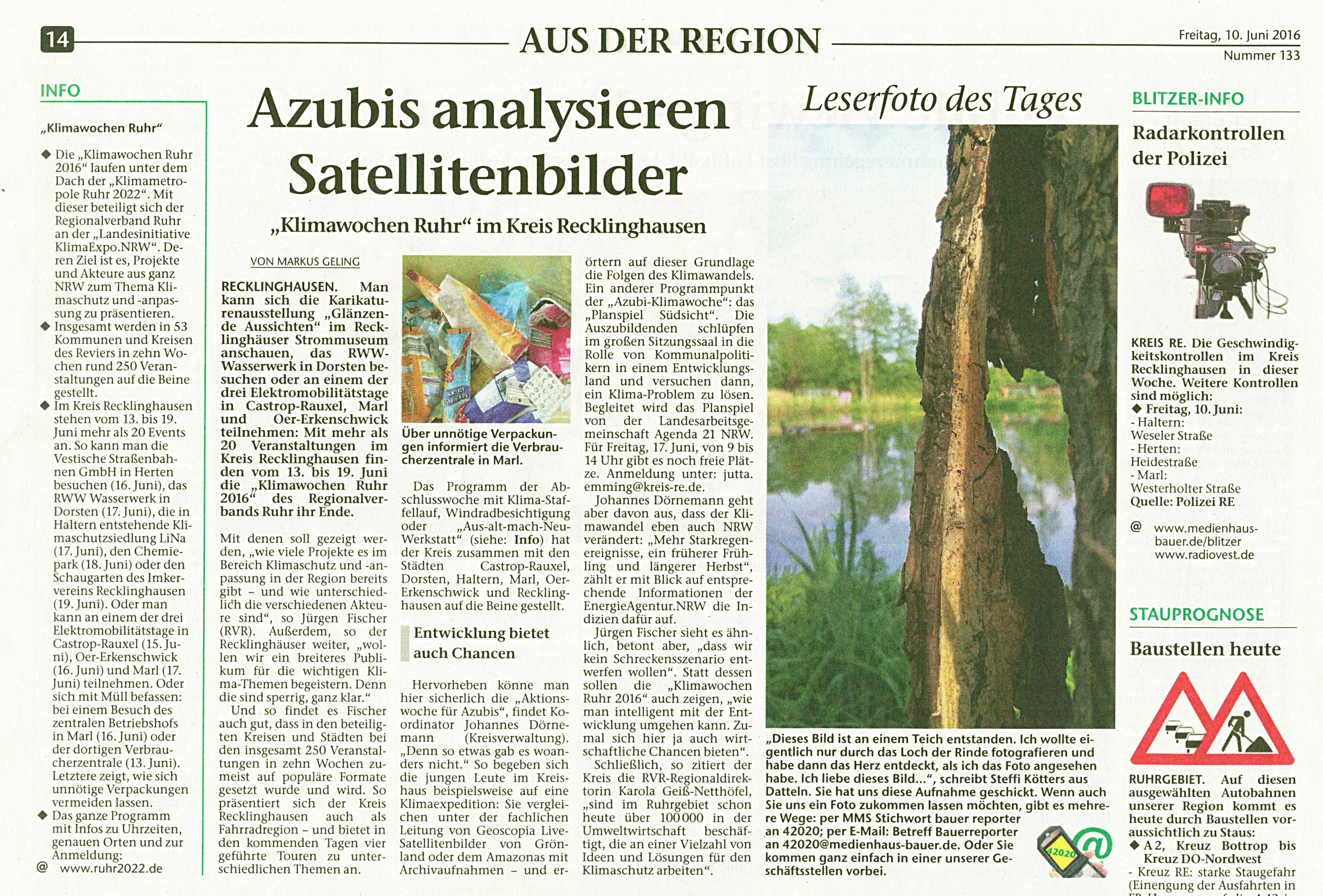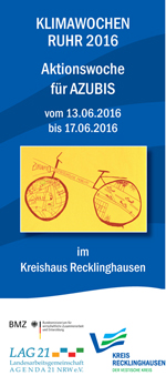 Die Veranstaltungswoche vom 13. - 19. Juni 2016 richtete sich an die Azubis aus den Kreisangehörigen Städten und dem Kreis Recklinghausen und ging aus einem gemeinsamen Vorschlag der Klimaschutzmanager / Klimaexpo-Beauftragten der Städte Recklinghausen, Dorsten, Haltern am See, Marl, Oer-Erkenschwick, Gladbeck, Castrop-Rauxel und des Kreises Recklinghausen - als Gemeinschaftsinitiative für die Klimawoche der