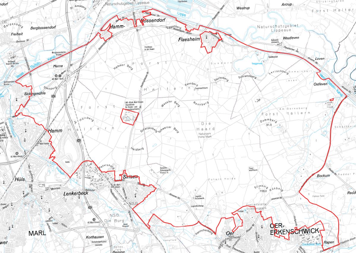 In diesem reizvollen, waldreichen Übergangsbereich zwischen Münsterland und Ruhrgebiet herrschen beste Voraussetzungen für den Ausbau der landschaftsorientierten Erholung. Zudem liegen im Planungsraum zahlreiche besonders schützenswerte Bereiche von Natur und Landschaft, wie die Feuchtgebiete um das Weiße Venn und die Mühlenbachaue sowie Teile der Wälder der Hohen Mark.