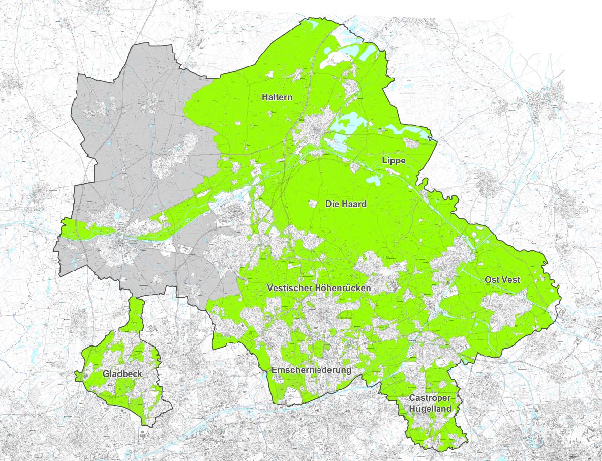 Die Landschaftspläne im Kreis Recklinghausen sind nach naturräumlichen Zusammenhängen - städteübergreifend abgegrenzt. Eine „naturräumliche“ Abgrenzung hat - z.B. im Vergleich zu dem Versuch einer gemeindeweisen Abgrenzung den großen Vorteil, dass zusammenhängende Naturräume in planerischen Zusammenhängen bearbeitet werden müssen - und können.