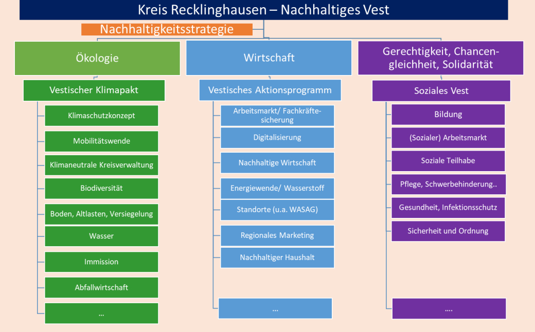 Im September 2021 hat der Kreistag das Konzept "Nachhaltiges Vest" beschlossen. Nachhaltige Entwicklung kann nur erreicht werden, wenn umweltbezogene, wirtschaftliche und soziale Aspekte gleichzeitig und gleichberechtigt in den Blick genommen werden. Bereits jetzt tragen die vielfältigen und umfassenden Tätigkeiten des Kreises zu den von der UNO beschlossenen 17 Zielen der Nachhaltigkeit bei (Sustainable Development Goals). Hier können Sie das Konzept und ergänzende Dokumente im Bürgerinfomationssytem unter der Vorlage Nr. 2021/111 abrufen.